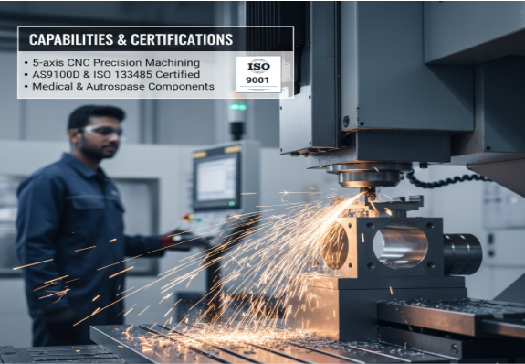 Example: “Precision machining for aerospace and medical devices. AS9100D and ISO 13485 certified. 5-axis CNC capabilities with ±0.0001″ tolerances.” This immediately signals expertise to technical buyers.